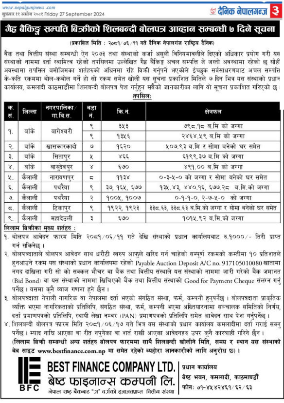 7 days NBA auction notice as published on National Daily ‘Arthik’ on 2081-09-07