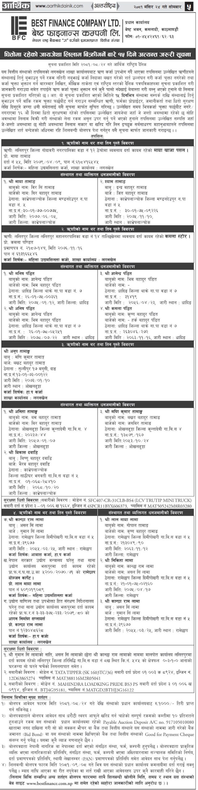धितोमा रहेको जायजेथा लिलाम बिक्री गर्नेबारे १५ दिने अत्यन्त जरुरी सूचना (Published in Arthik National Daily)