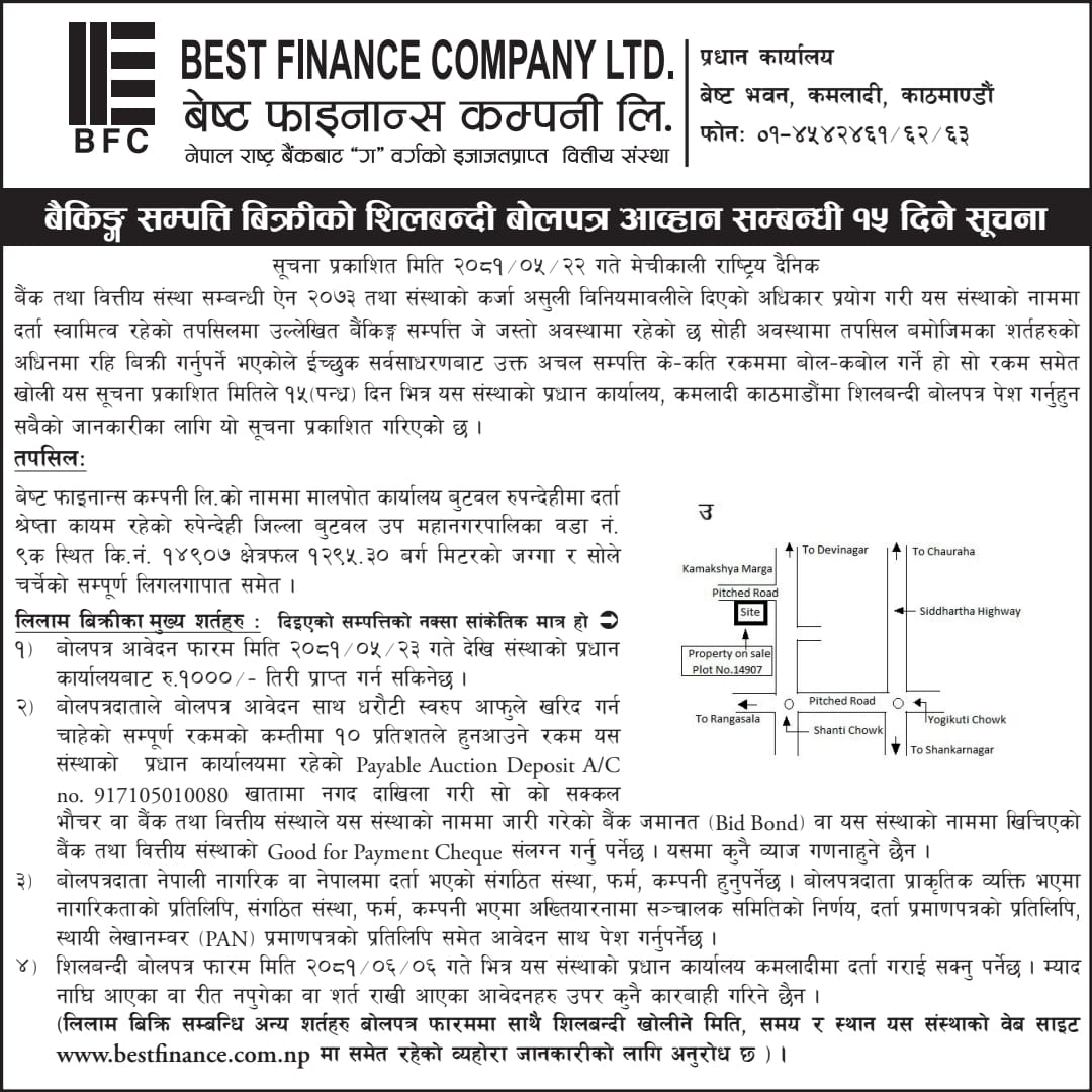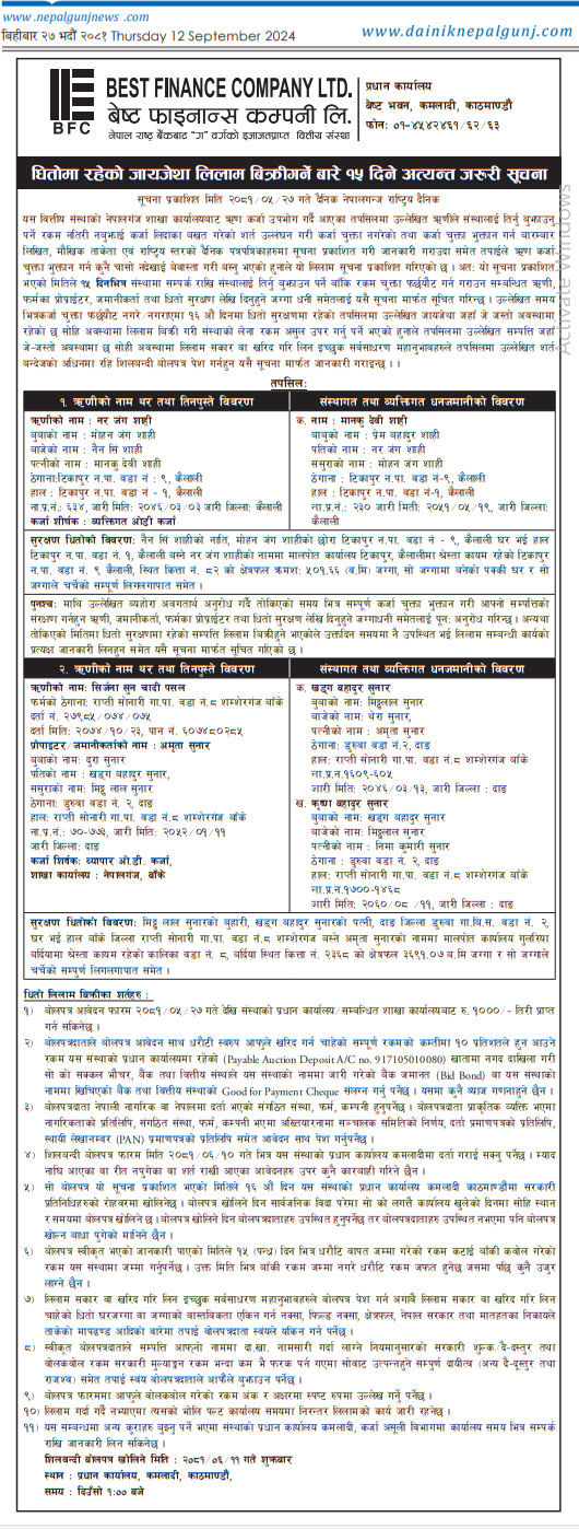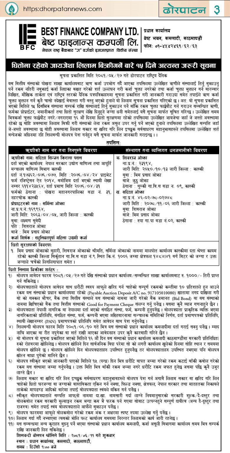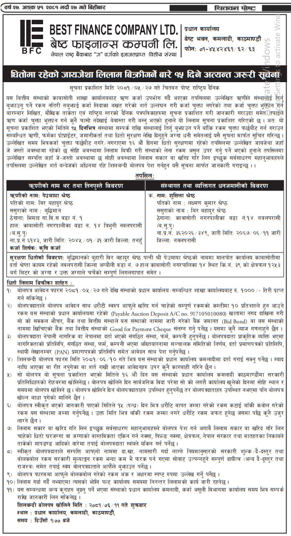 बैंकिङ्ग सम्पति बिक्रीको शिल्बन्दी बोल्पत्र आव्हान सम्बन्धि १५ दिने सुचना as published on Blast National Daily