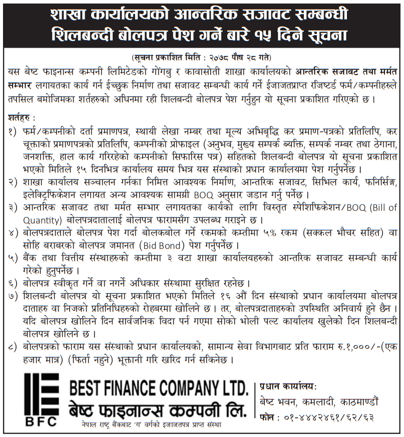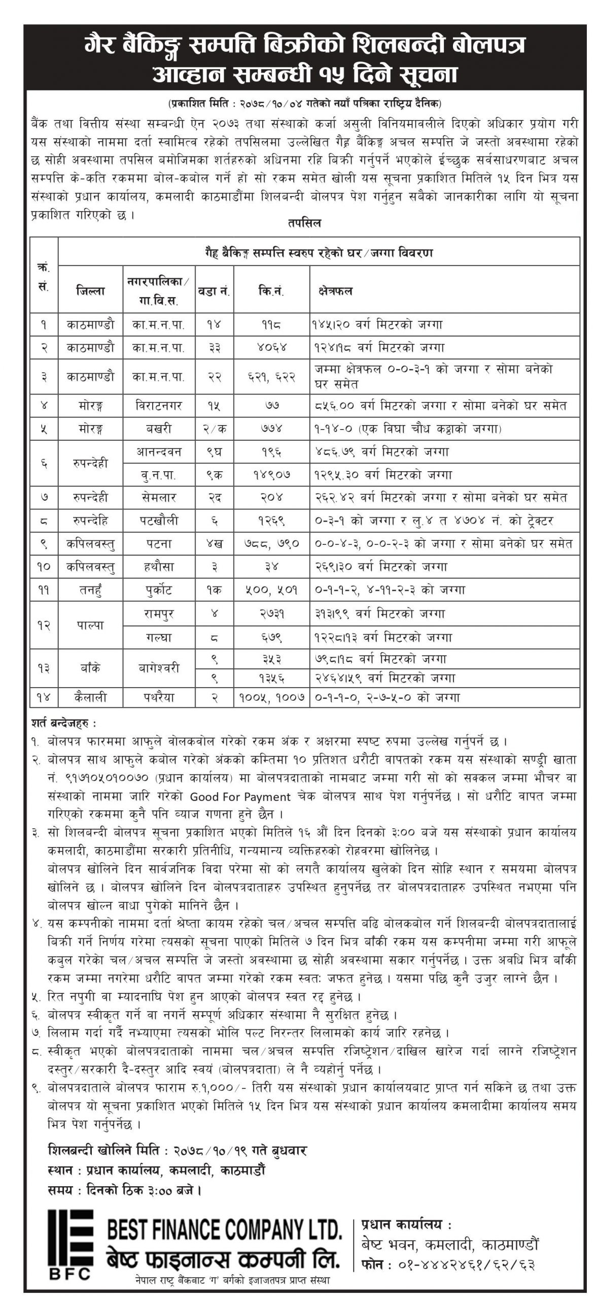 गैर बैन्किङ सम्पत्ति बिक्रीको शिल्बन्दी बोल्पत्र आव्हन सम्बन्धी १५ दिने सुचना !!