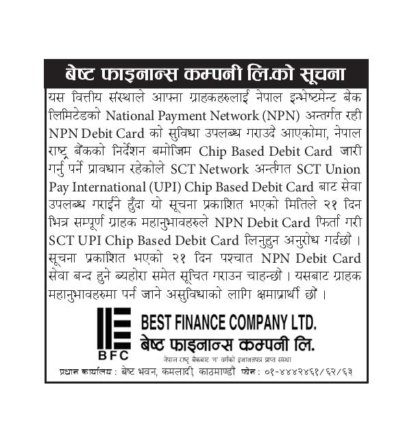 !!! पुरानो NPN कार्ड फिर्ता गरी नयाँ SCT Chip Based कार्ड लिनुहुन सम्पूर्ण ग्राहक महानुभावहरुमा हार्दिक अनुरोध गर्दछौ। !!!