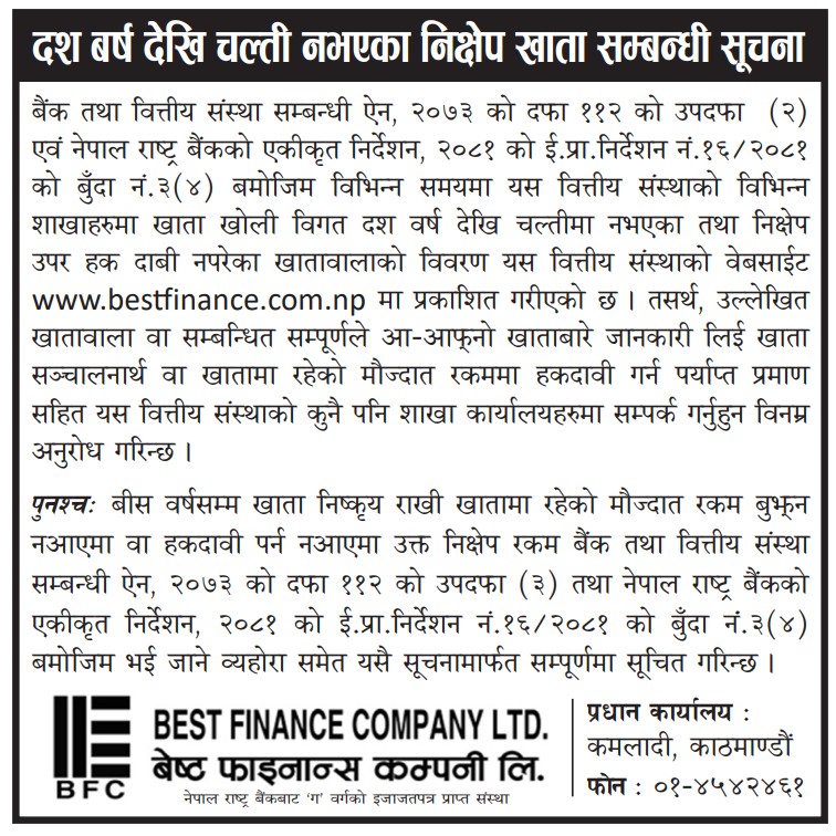 दश बर्ष देखी चल्ती नभएका निक्षेप खाता सम्बन्धी सुचना
