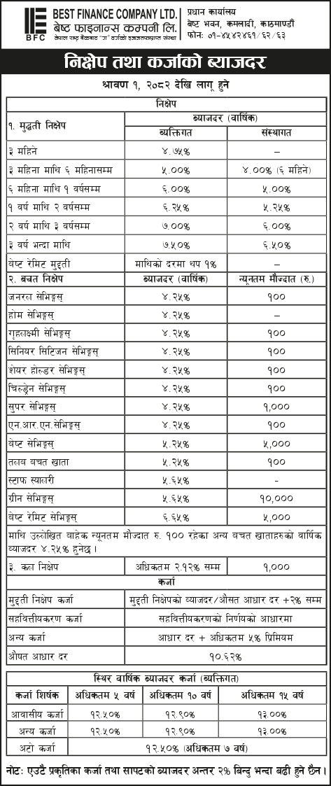 श्रावण १, २०८२ देखि लागू हुने ब्याजदरहरू