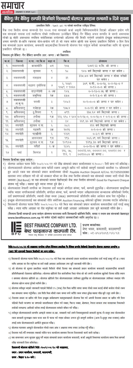 बैकिङ्ग/गैर बैकिङ्ग सम्पत्ति विक्रिको शिलवन्दि वोलपत्र आह्वान सम्वन्धि ७ दिने सूचना (नागरिक दैनिकमा प्रकाशित)