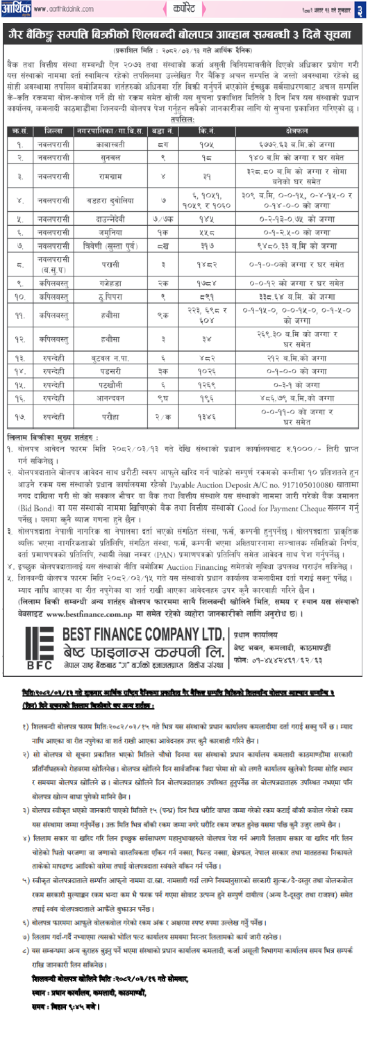 गैर बैंकिङ्ग सम्पत्ति बिक्रीको शिलबन्दी बोलपत्र समस्या सम्बन्धी ३ दिने सुचना (आर्थिक दैनिकमा प्रकाशित)