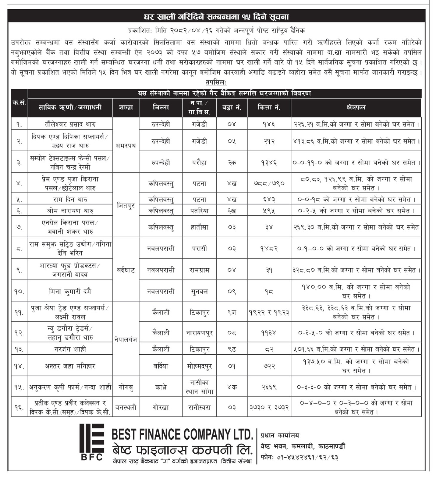 घर खाली गरिदिने सम्बन्धी १५ दिने सुचना