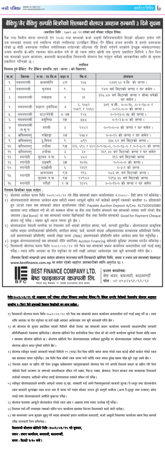 बैकिङ्ग/गैर बैकिङ्ग सम्पत्ति विक्रिको शिलवन्दि वोलपत्र आह्वान सम्वन्धि ३ दिने सूचना ( नयाँ पत्रिकामा प्रकाशित)
