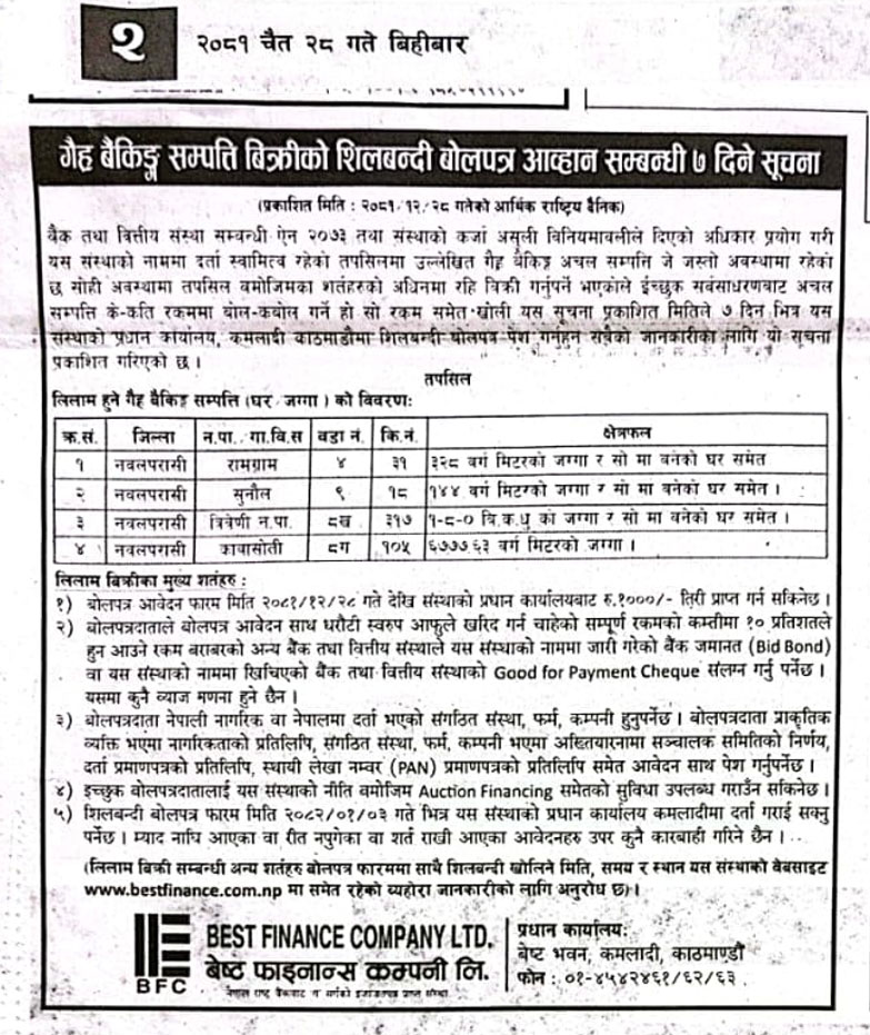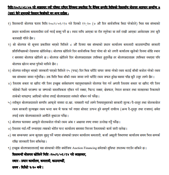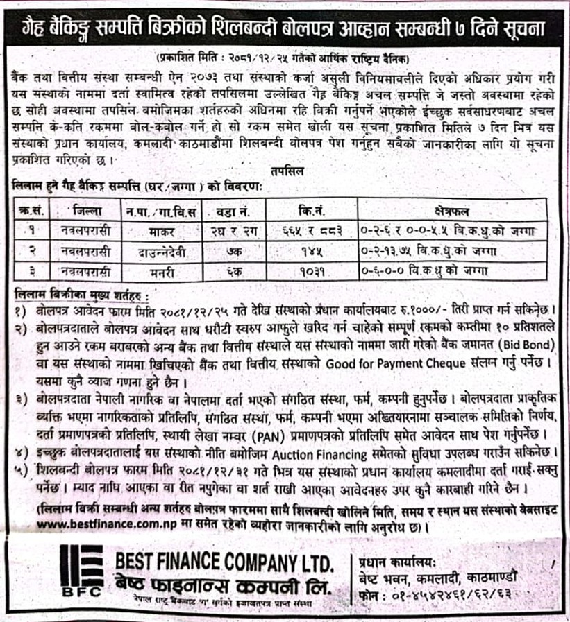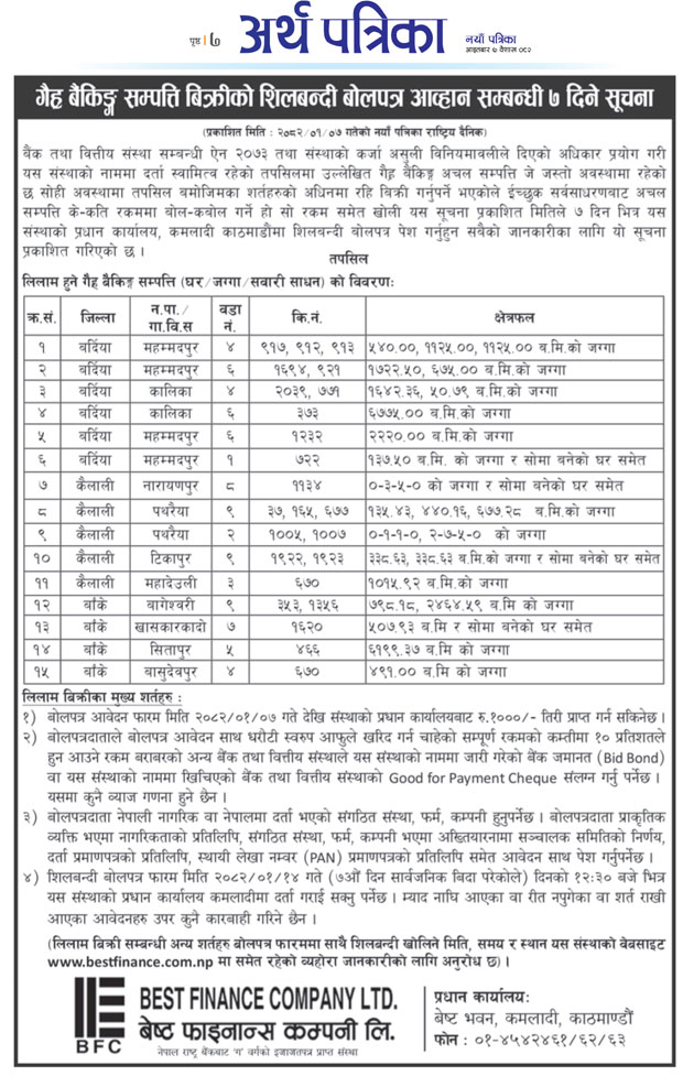 मिति: २०८१/१२/२५ गते सोमबार आर्थिक राष्ट्रिय दैनिकमा प्रकाशित गैर बैंकिङ सम्पत्ति बिक्रीको शिलबन्दी बोलपत्र आव्हान सम्बन्धी ७ दिने सुचनाका थप अन्य शर्तहरु