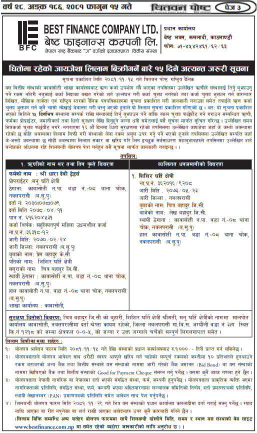 गैर बैंकिङ लिलाम बिक्री गर्नेबारे १५ दिने अत्यन्त जरुरी सूचना (In Chitwan Post National Daily)