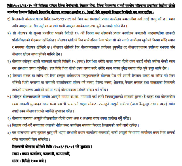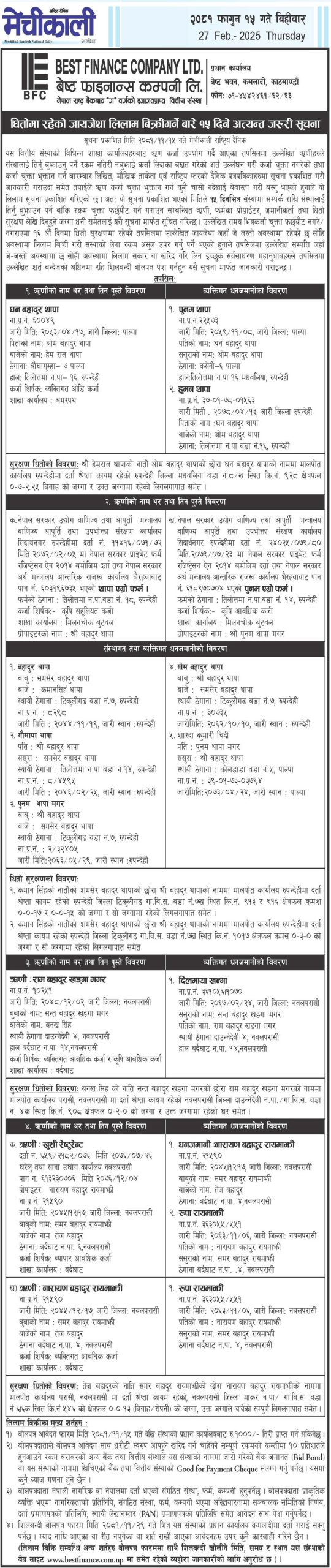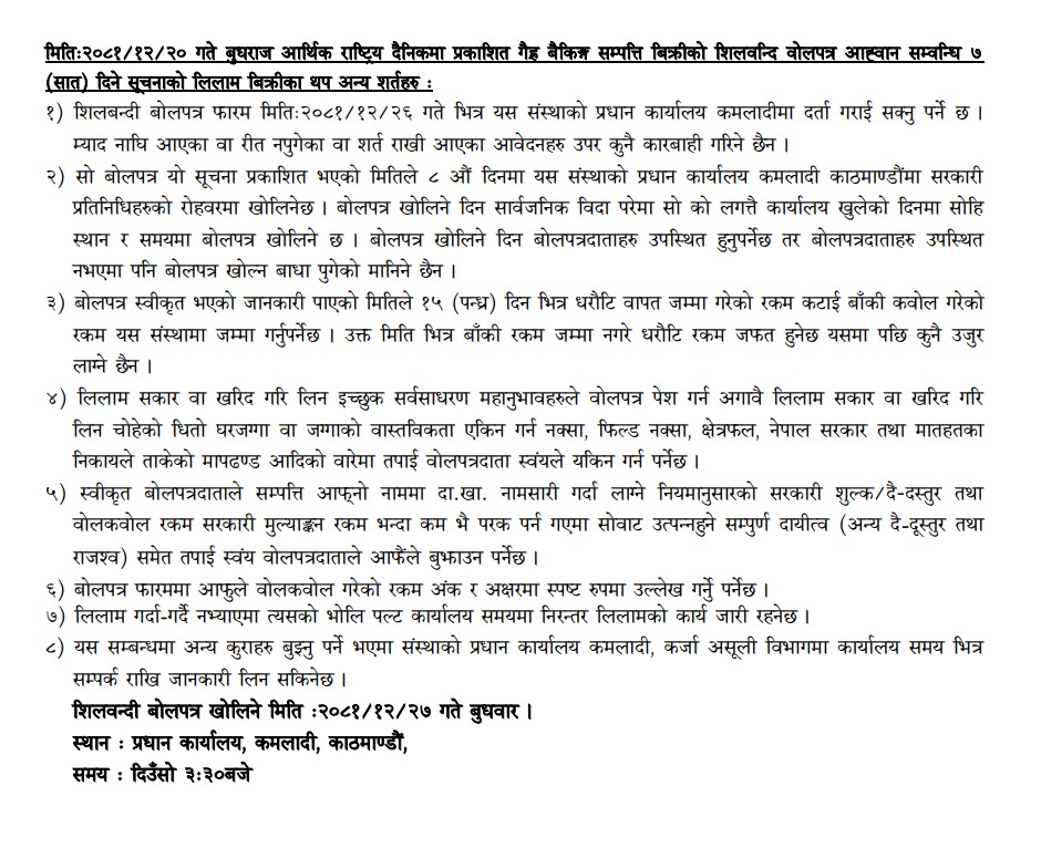गैर बैंकिङ लिलाम बिक्री गर्नेबारे १५ दिने अत्यन्त जरुरी सूचनाका थप अन्य शर्तहरु