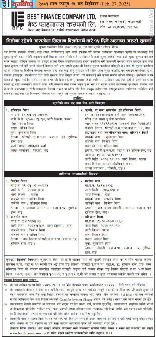 गैर बैंकिङ लिलाम बिक्री गर्नेबारे १५ दिने अत्यन्त जरुरी सूचना (In Naya Yugbodh National Daily)