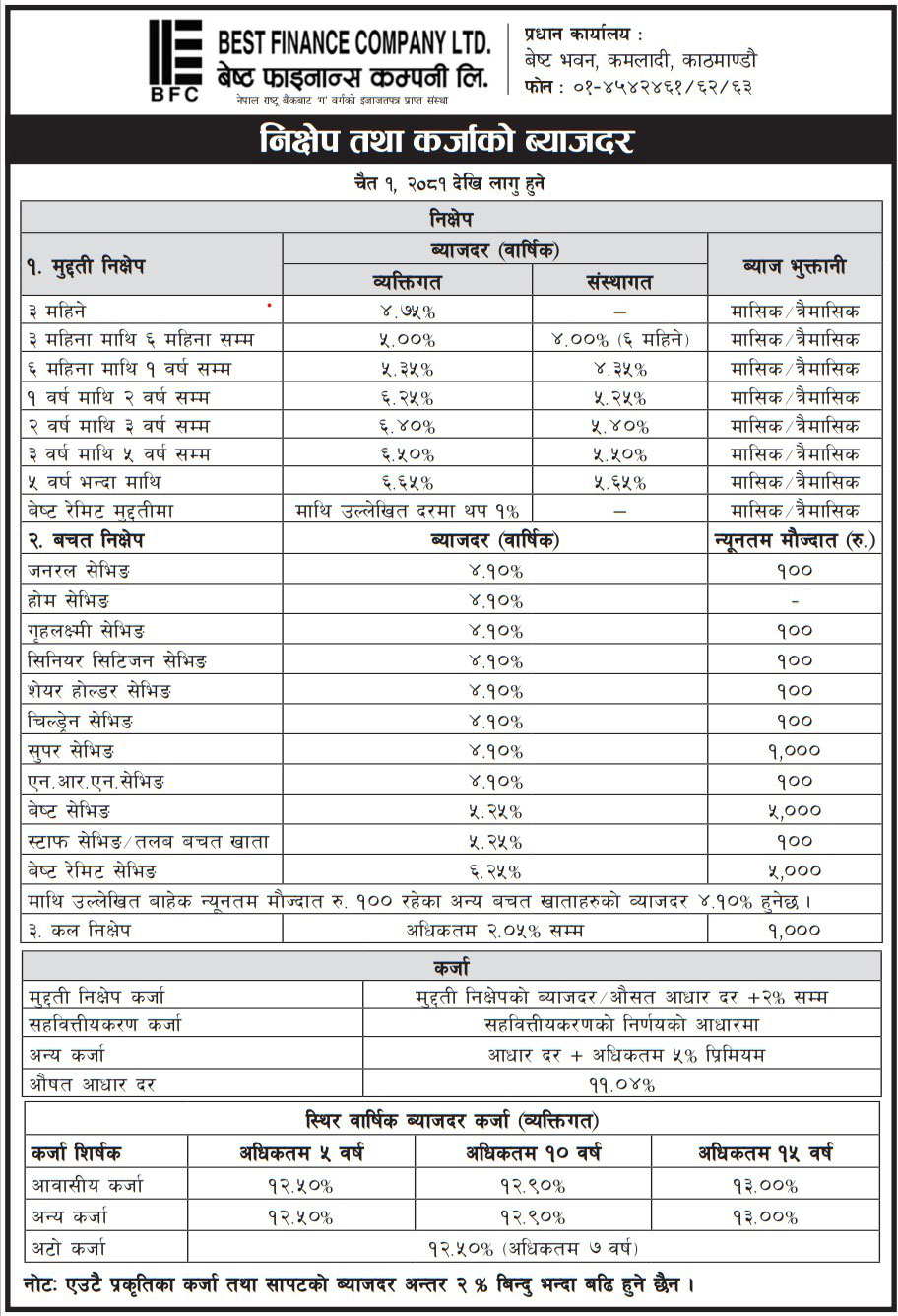 Interest Rates effective from 1st Chaitra 2081 BS