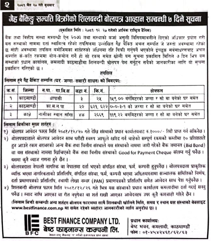 गैर बैंकिङ लिलाम बिक्री गर्नेबारे ७ दिने अत्यन्त जरुरी सूचनाका थप अन्य शर्तहरु (In Arthik National Daily)