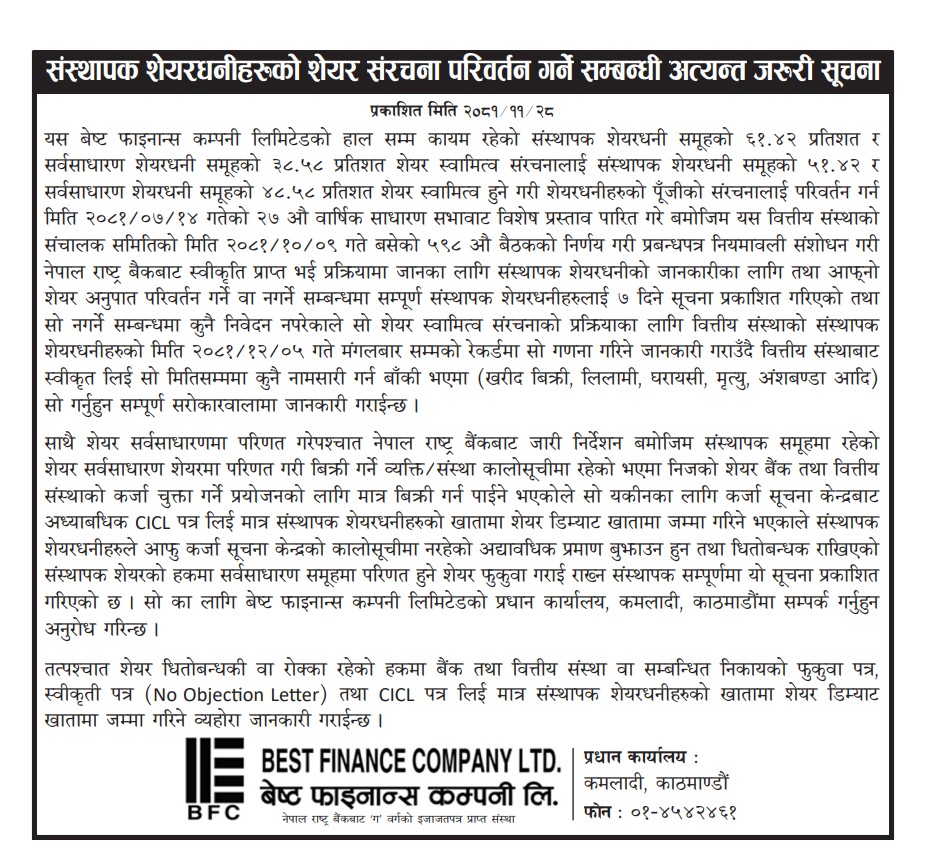 संस्थापक शेयर धनीहरुको शेयर संरचना परिवर्तन सम्बन्धी अत्यन्त जरुरी सुचना